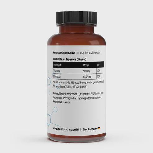 Magnesium ascorbate 77.4% (contains 76% vitamin C/ 10% magnesium), coating agent: hydroxypropyl methylcellulose, acacia fiber, L-leucine.